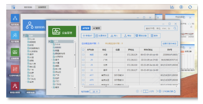 网络状态在系统中顺利获得各种图表,让管理者一目了然分析和维护整张网络,页面的网络配置、组织组织配置、使用状态统计、故障诊断及告警等各种功能组件轻松管理和维护无线网络。